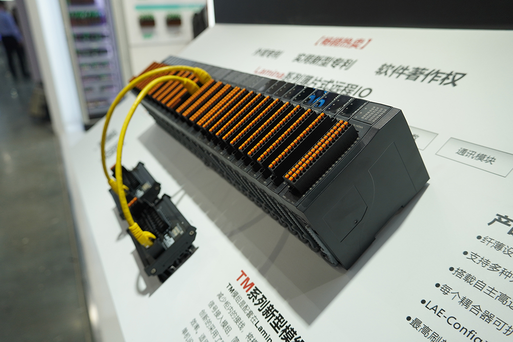 LAMINA系列薄片式遠程I/O,是展示期間最受客戶關(guān)注的產(chǎn)品。該系列I/O支持5種PLC總線協(xié)議,其中包括PROFINET,EHTERNET/IP,ETHERCAT,CC-LINK IE FB,MODBUS TCP。可支持32個模塊擴展,無需饋電模塊,模塊種類豐富,包含了數(shù)字量輸入輸出,模擬量輸入輸出,熱電偶,熱電阻,脈沖輸入、輸出,定位、485/232等多達20多種功能模塊。